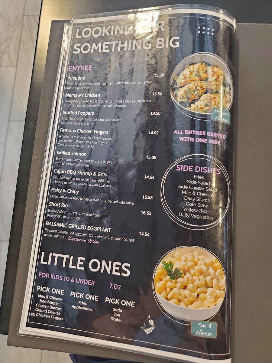 For those craving something substantial, indulge in Memaw's Chicken, featuring grilled chicken topped with flavorful spinach and artichoke dip, or savor the Grilled Salmon drizzled with blueberry onion jam. Families will appreciate the 'Little Ones' menu, offering kid-friendly favorites like mac & cheese and chicken fingers.